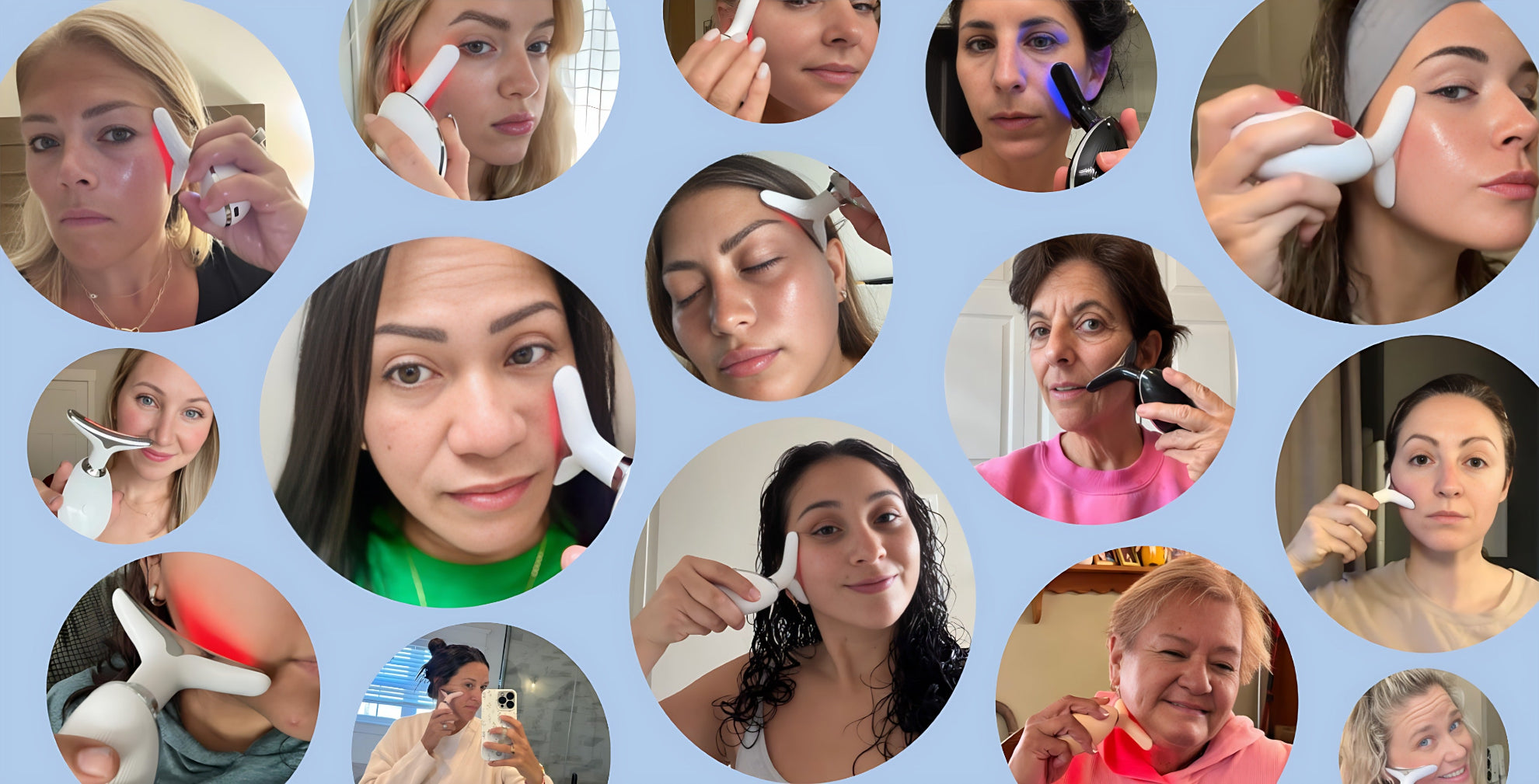 Lumvera pairs gentle microcurrent with targeted LED light. Microcurrent delivers low-level electrical signals across the skin to support tone and definition. LED adds targeted wavelengths to help with the look of fine lines, uneven tone, and acne. Together they create a fast 10-minute routine you can repeat at home.